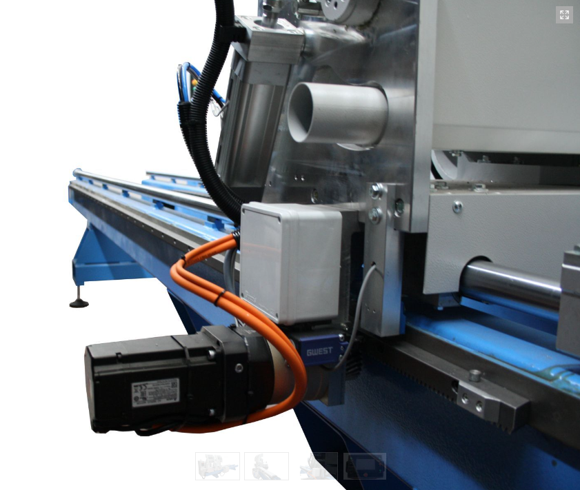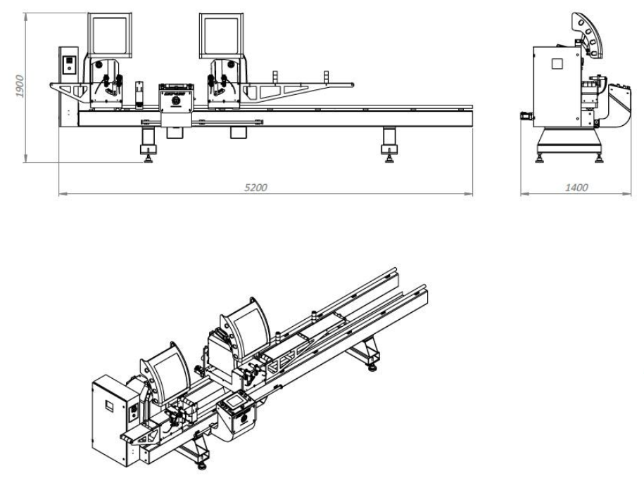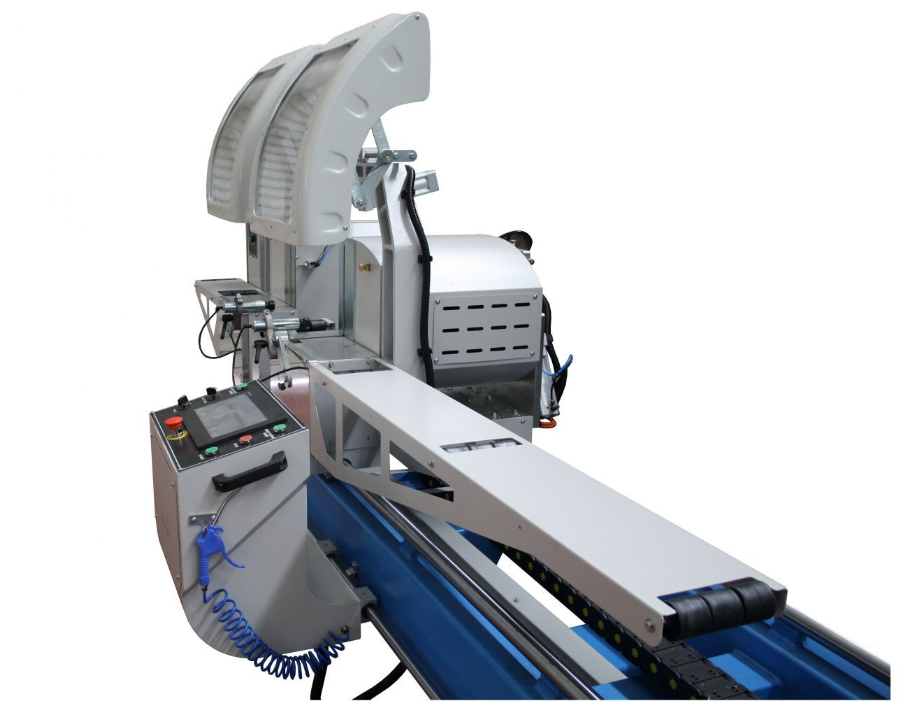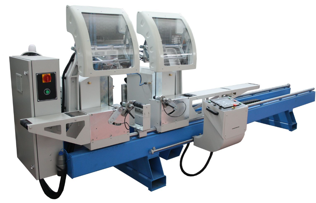 Cortadora automática de dos cabezales con un cabezal fijo y otro móvil, para el corte de perfiles de PVC.